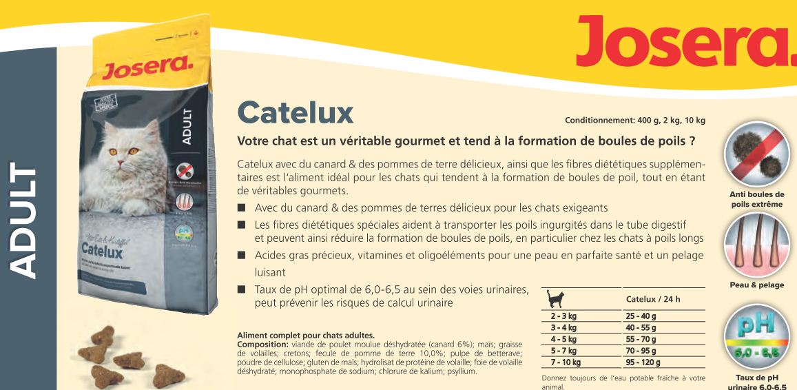 Josera Catelux, riche en canard et en poulet, est adaptée aux chats adultes et particulièrement aux chats un peu difficiles ou gourmets.